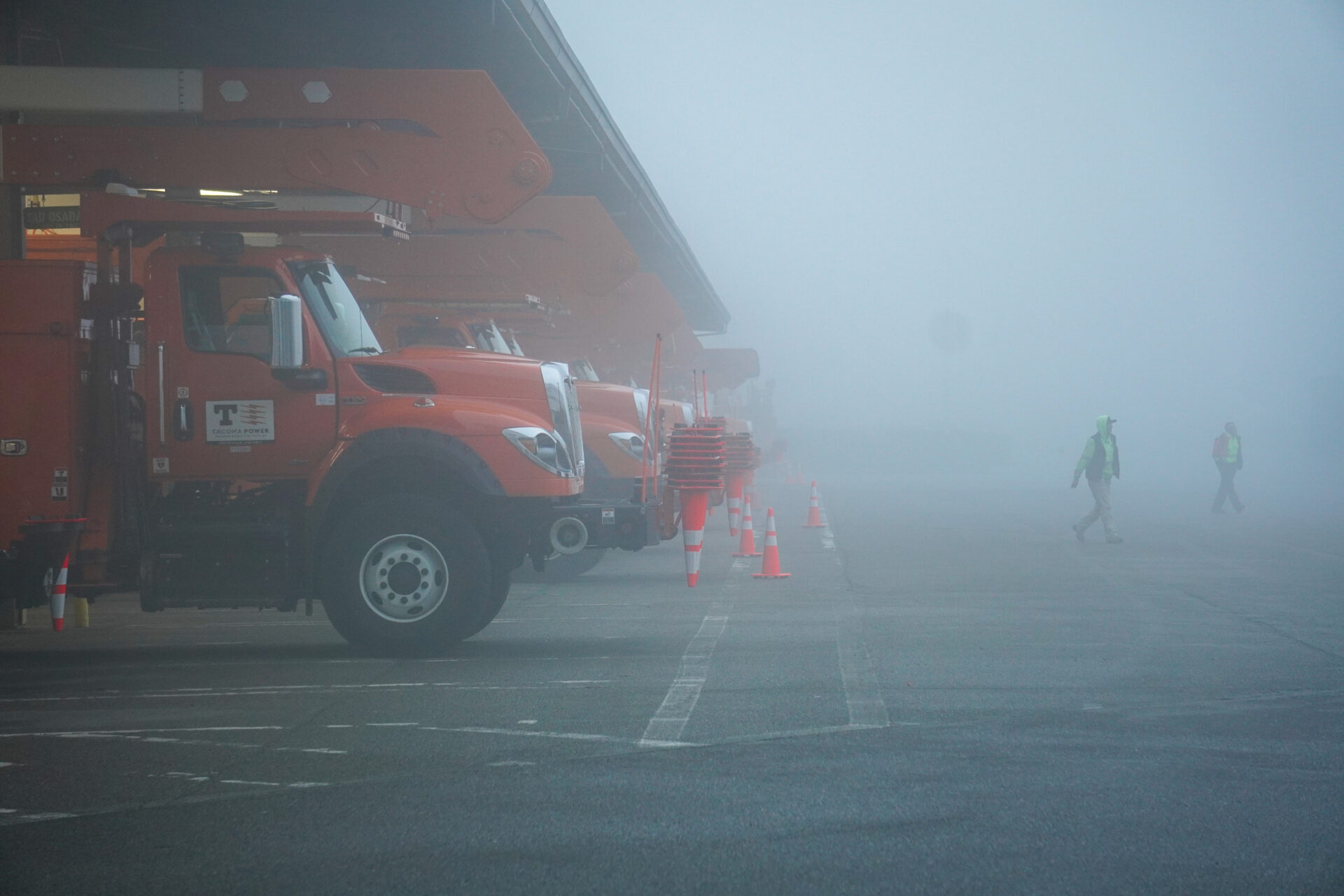 Tacoma Power Trucks and Crews on Foggy Day