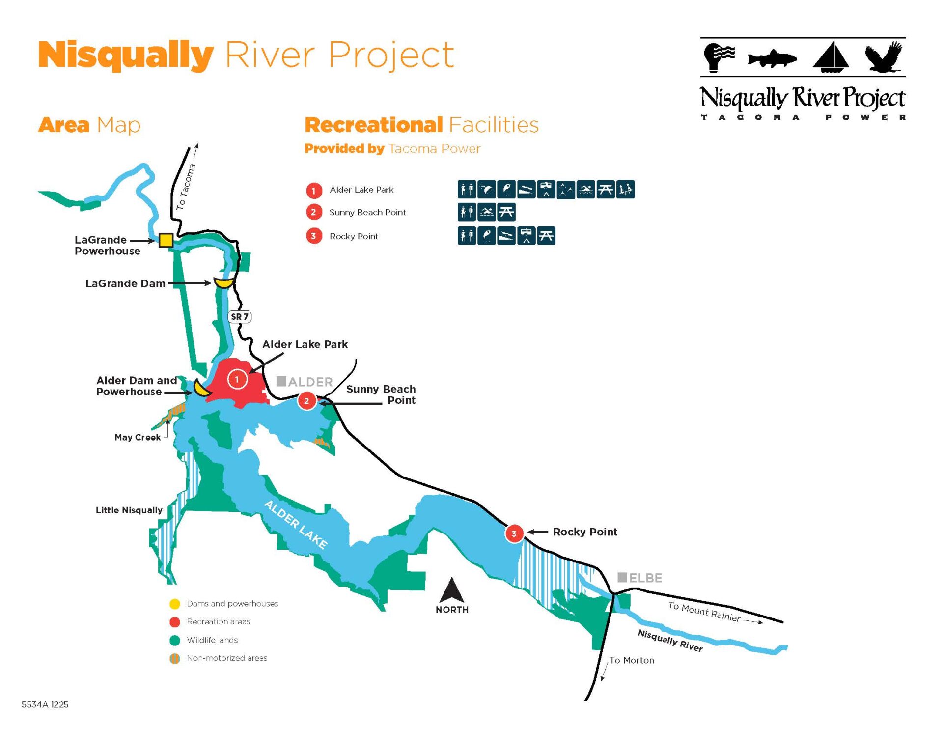 Public recreation at Alder Lake, Rocky Point Campground, and Sunny Beach Point, including boating, fishing, camping, water skiing, and day use